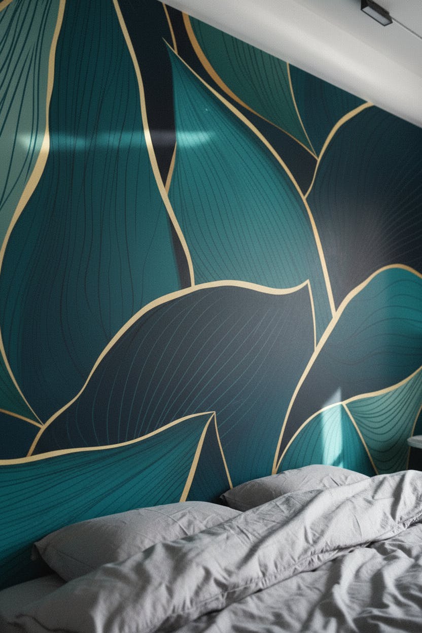 DER Entenblaue Schlafzimmertapete für Erwachsene zeichnet sich durch sein elegantes und einzigartiges Design aus, das eine Reihe von darstellt große Blätter. Die subtile Mischung aus Blaugrün- und Goldtönen erzeugt einen auffälligen visuellen Effekt, perfekt für alle, die einen Hauch von hinzufügen möchten Erfrischung und Eleganz in ihr Zimmer.