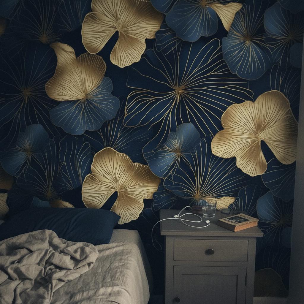 Entdecken Sie die Art Deco Blaue Tapete Große Goldene Blumen, ein wahres Design-Meisterwerk, das tiefes Blau und leuchtendes Gold zu einem faszinierenden visuellen Effekt kombiniert. Diese spektakuläre Tapete passt perfekt in verschiedene Räume wie das Wohnzimmer oder das Schlafzimmer für Erwachseneund verleiht einen Hauch von Glamour und Eleganz. Ideal für die Schaffung eines anspruchsvollen und modernen Ambientes. Ihr großformatiges Blumenmuster liegt voll im Trend und macht diese Tapete zu einer unverzichtbaren Wahl für eine raffinierte Inneneinrichtung.