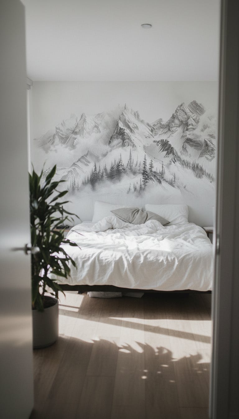 Ce motif montagneux rappelle la sérénité et la majesté de la nature, créant une ambiance de calme et de détente dans la pièce. Le jeu de l'ombre et de la lumière donne de la profondeur au design, transformant chaque mur en un paysage panoramique illusionniste qui invite à l'évasion.