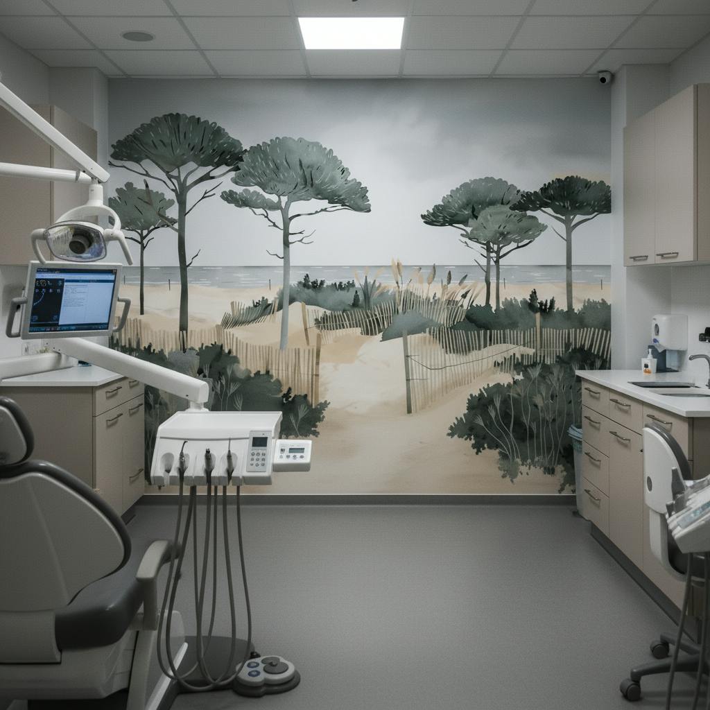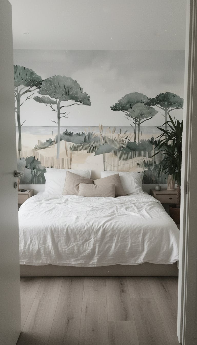 Le design unique du Papier Peint Panoramique Paysage Chambre capture la beauté et la sérénité de la nature. Les motifs de paysage côtier avec des arbres délicats et des nuances douces de vert et de beige créent un sentiment de calme.