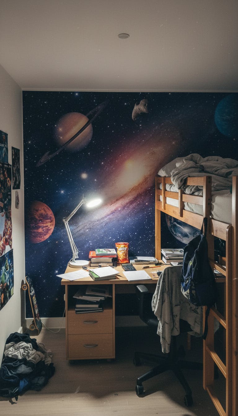 Werten Sie das Schlafzimmer Ihres Kindes mit dieser Tapete mit einem Weltraum- und Planetenthema auf!