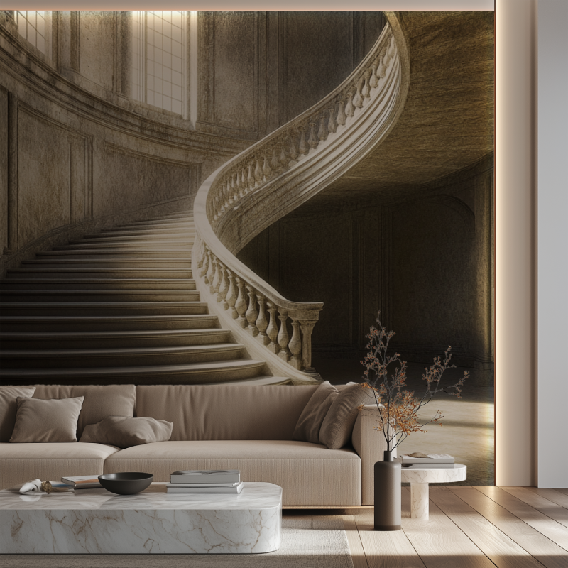 Transform your space with the Trompe L'oeil Staircase Wallpaper , a bold creation combining realism and elegance . This wallpaper creates a captivating visual illusion effect with its 3D staircase design, perfect for adding dimension to your living room or bedroom . Its visual impact transforms an ordinary interior into a sophisticated and enchanting space.