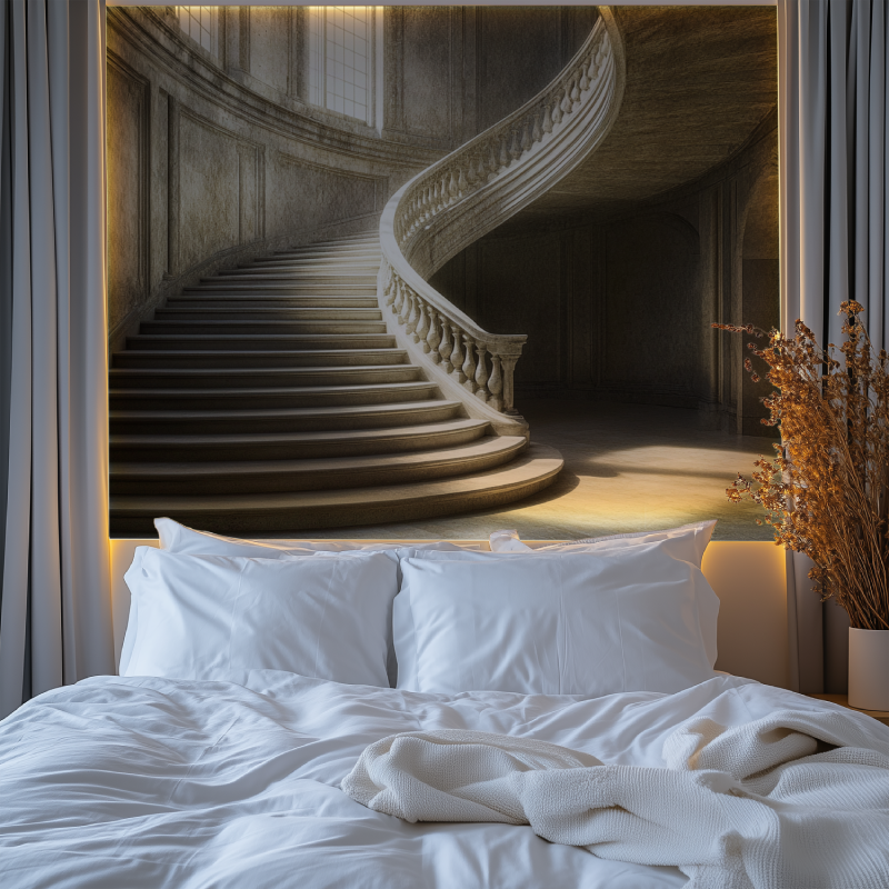 The unique design of the Trompe L'oeil Staircase Wallpaper captures the imagination with its stunning depth effect. The soft shades of gray and beige bring timeless elegance, while the illusion of a majestic staircase draws the eye and invites you to dream.