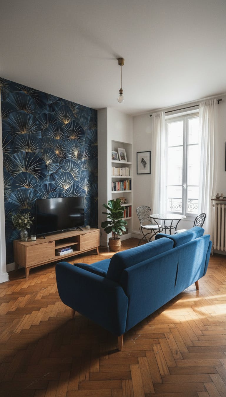 Découvrez le Papier Peint Art Déco Bleu Et Or Design, un chef-d'œuvre décoratif qui embellira votre intérieur avec ses lignes dorées élégantes et ses teintes bleues profondes. Idéal pour le salon ou la chambre adulte, ce papier peint ajoute une touche de sophistication et de modernité à tout espace.