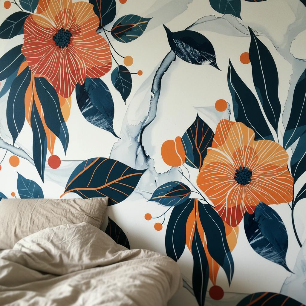 Le design unique de ce papier peint, avec ses motifs floraux géométriques en bleu et orange, attire instantanément l'œil et donne une profondeur visuelle à vos murs. Ces couleurs éclatantes, combinées à un fond blanc pur, créent une ambiance à la fois élégante et énergique.