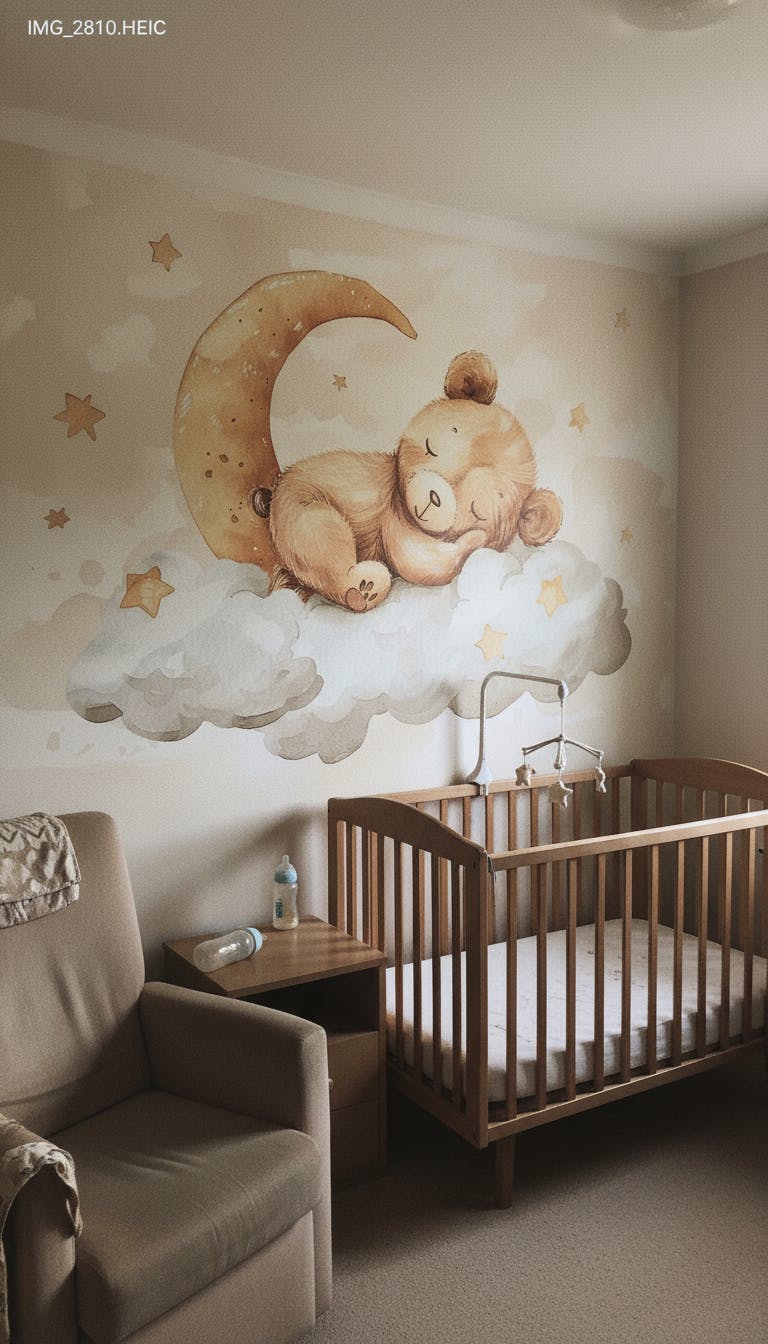 Le design unique du Papier peint chambre bébé ourson met en valeur un adorable ourson endormi sur un nuage doux et moelleux, surplombé par une lune scintillante. Les couleurs pastel beige, blanc et doré donnent une atmosphÚre calme et sereine, idéale pour une chambre de bébé.