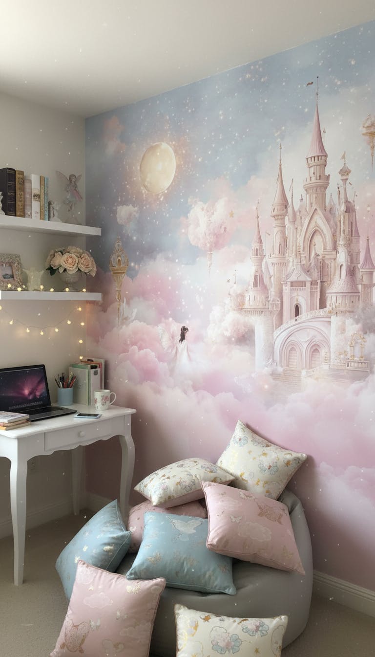 Que ce soit pour une chambre de fille ou un espace de jeu, ce papier peint incarne parfaitement les tendances actuelles de décoration intérieure axées sur la fantaisie et l'évasion.