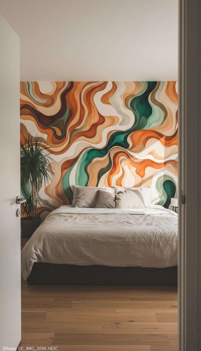 Le design unique du Papier Peint Vert Et Orange attire immédiatement l'attention par ses motifs ondulants et fluides, qui mènent l’œil à travers un voyage visuel captivant. Les nuances de vert et d'orange se mélangent harmonieusement avec des teintes beige et marron, créant une esthétique warm et naturelle.